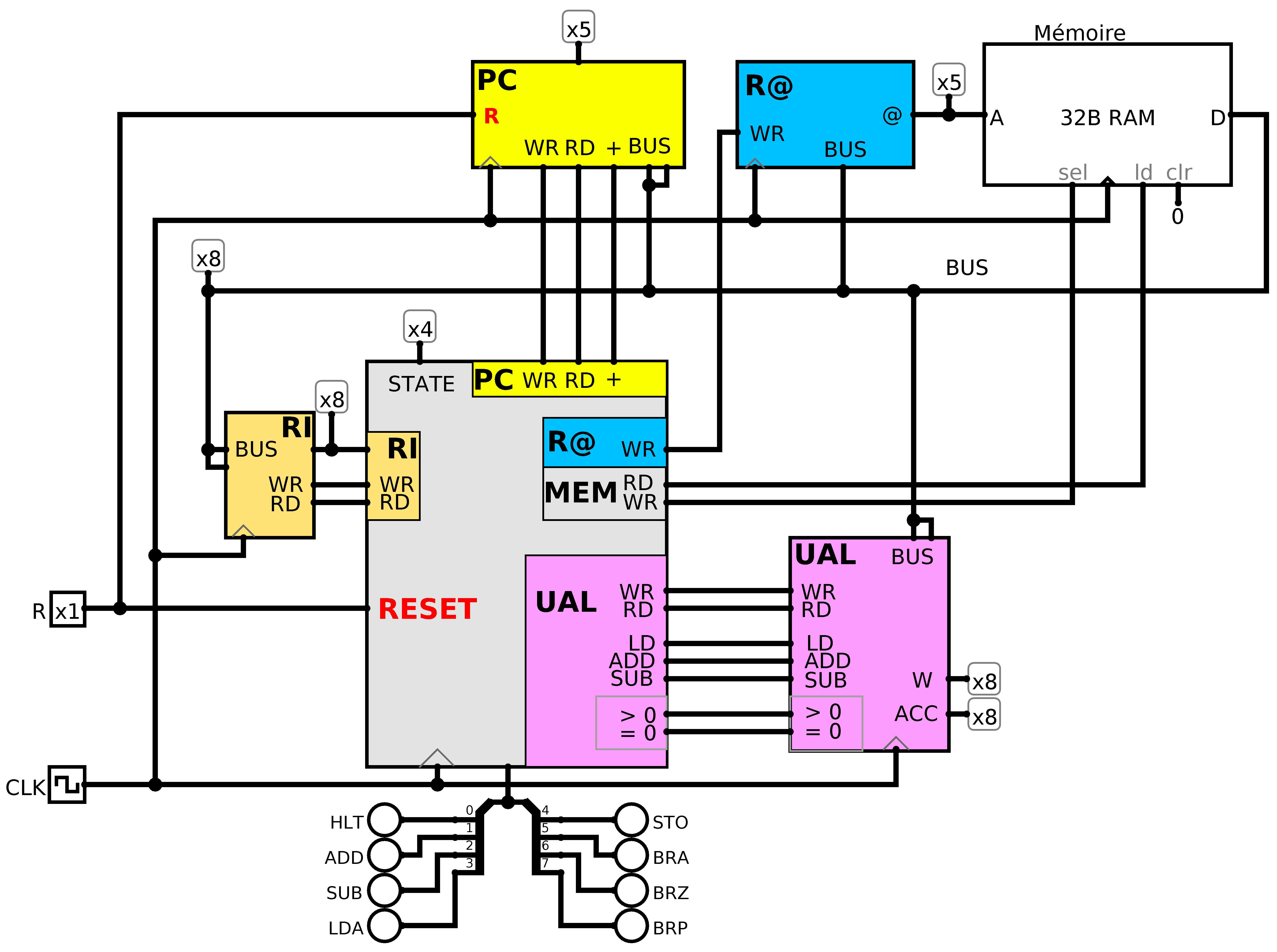 Les données en mémoire font 1 octet = 8 bits. On pourrait faire 2 lectures pour obtenir un mot de 2 octets = 16 bits. C'est le choix qui est fait en général pour les composants réels. Ici nous choisissons la simplicité ce qui nous met un peu à l'étroit ! Néanmoins, avec ces 8 instructions, nous pourrons déjà écrire des programmes.