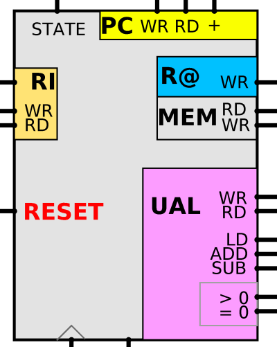 Ces quelques questions vous montre comment on peut définir les équations logiques de tous les signaux dont nous avons besoin et obtenir les transitions prévues par le schéma. Si nous voulions une UC plus performante avec un jeu d'instruction plus riche, le principe serait le même mais avec une machine à état plus volumineuse.