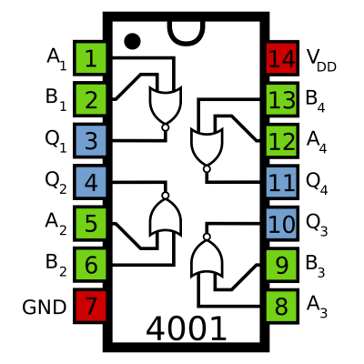 Ce genre de circuit – en un peu plus compliqué, une vingtaine de transistors au lieu de quatre – est réalisé 4 fois identique dans le circuit intégré 4001. Sur la droite, les symboles représentent des circuit OU-NON (NOR) en norme américaine.