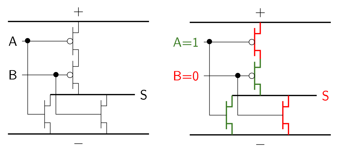 Ci-dessous, un exemple de réalisation d'un circuit logique. Les composants à 3 pattes sont des transistors.