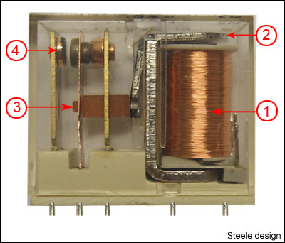 Un relais est un interrupteur commandé par un électro-aimant. Sur la figure, l'électro-aimant (1) peut actionner un levier (2) métallique qui va lui même déplacer une lame de métal (3) l'amenant ou non au contact de (4). La paire (3) - (4) est un interrupteur qui laisse passer ou non le courant.