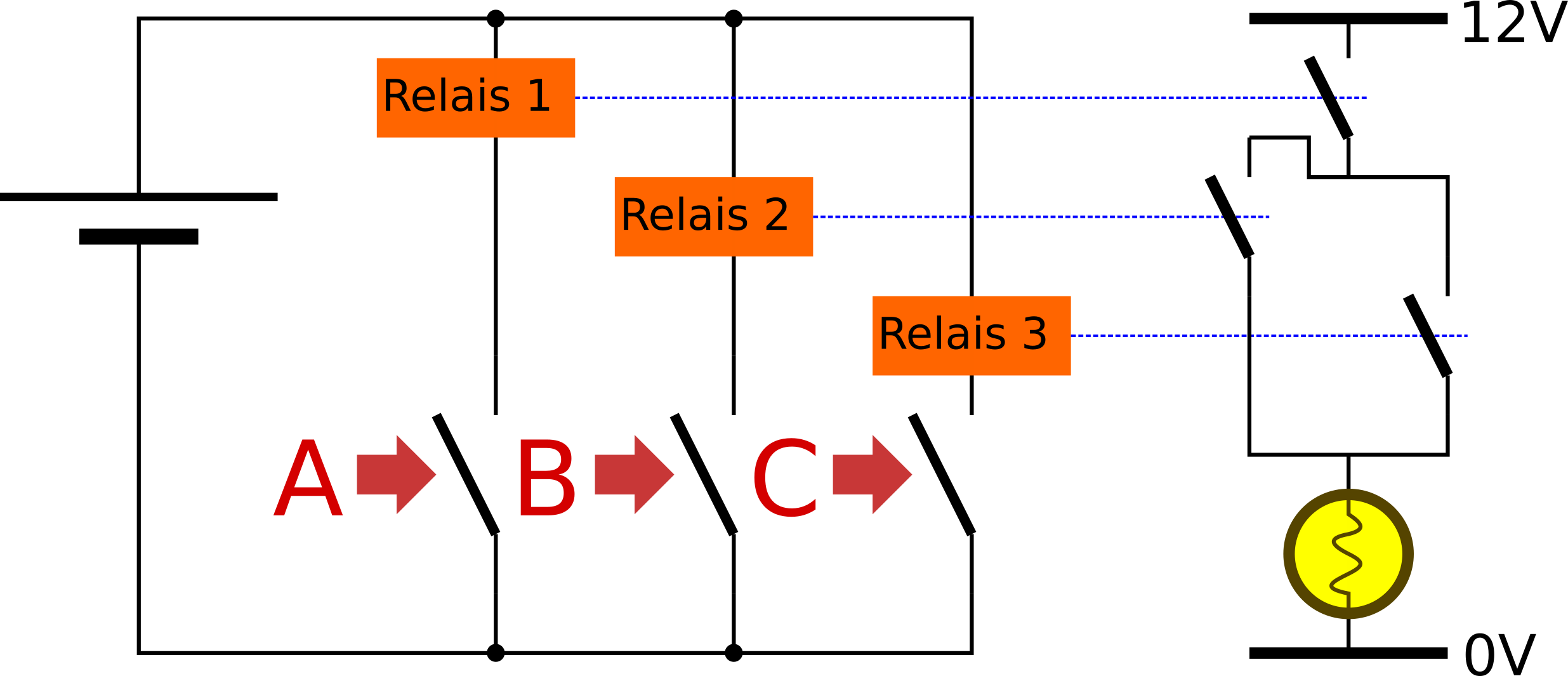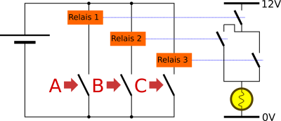 Ci-dessous un exemple de jeu de relais réalisant une fonction logique.