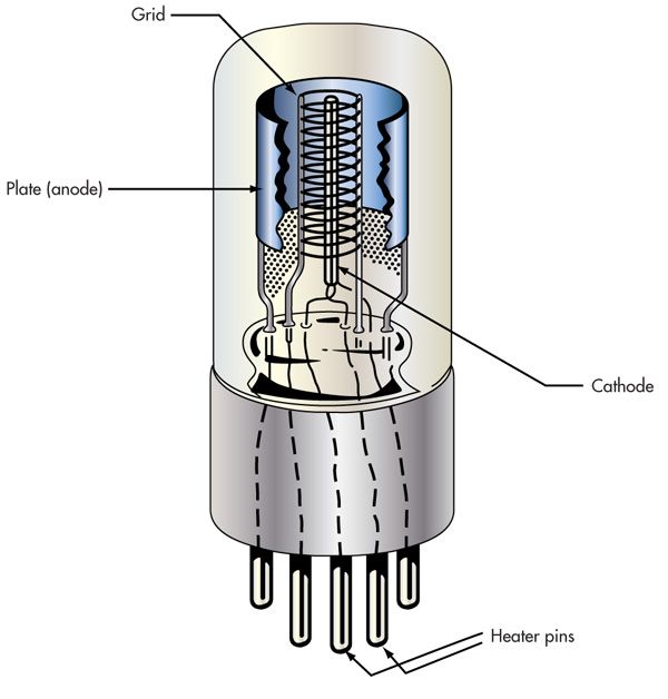 On a utilisé les diodes et les triodes. Je ne détaille pas le fonctionnement mais l'idée générale est que la grille (Grid) permet de contrôler le passage du courant électrique entre l'anode et la cathode. Il s'agit là encore d'un interrupteur commandé.