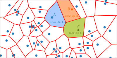 Considérons un nuage de points du plan. On souhaite délimiter des frontières. Ces frontières délimitent des zones. Sur la figure suivante, la zone de A est l'ensemble des points du plan qui sont plus proches de A que de n'importe quel autre point du nuage. La zone de B est l'ensemble des points les plus proches de B.