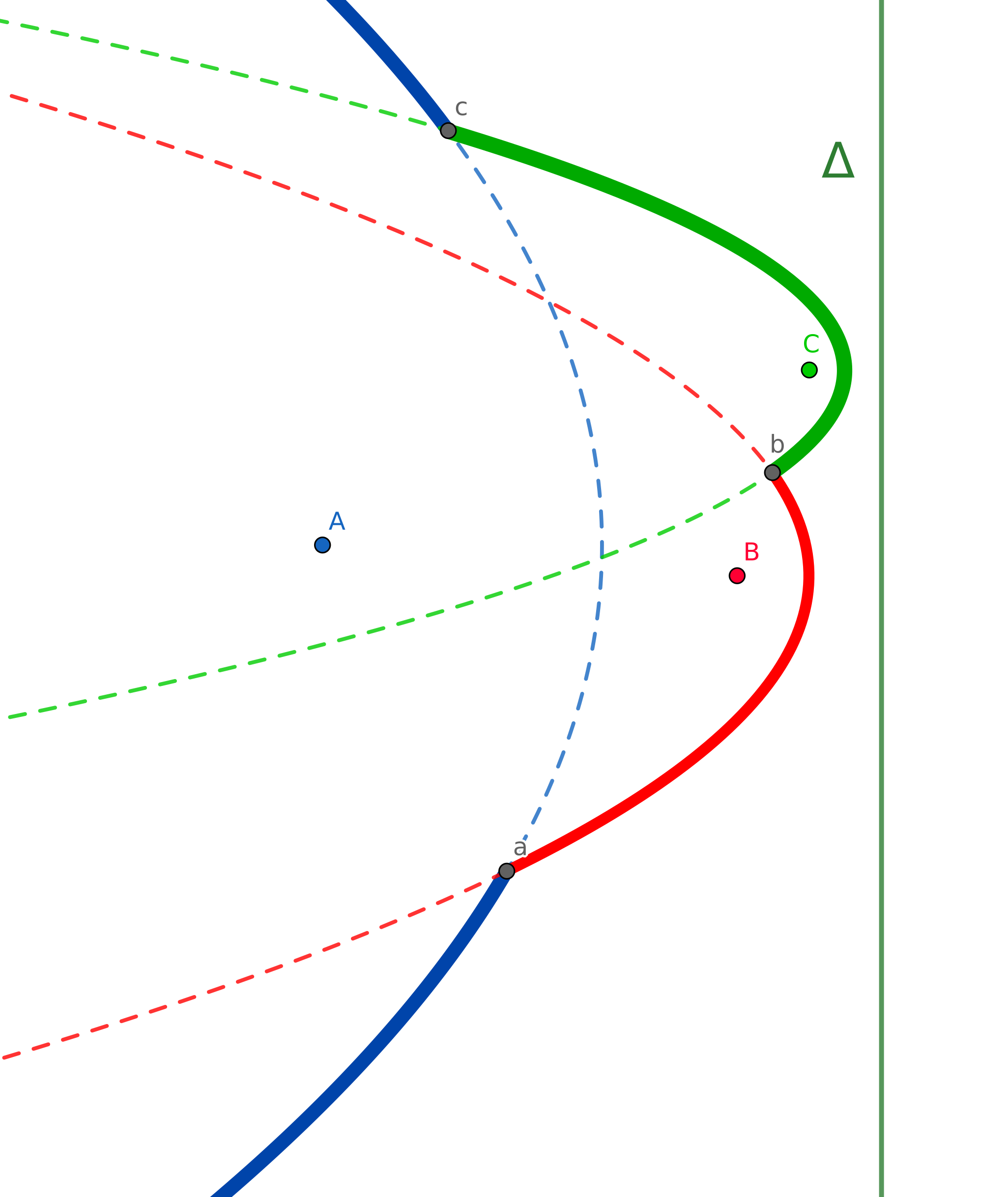 Dans l'exemple à gauche, il suffira de préciser, de bas en haut, ABCA. Cela veut dire ici que le bas de la plage est constitué par un arc de parabole de foyer A (en bleu), il est suivi d'un arc de parabole de foyer B (rouge), puis un arc de parabole de foyer C (vert) et enfin de nouveau un arc de parabole de foyer A (bleu). On peut calculer l'équation de chaque parabole et les coordonnées des intersections a, b, c.