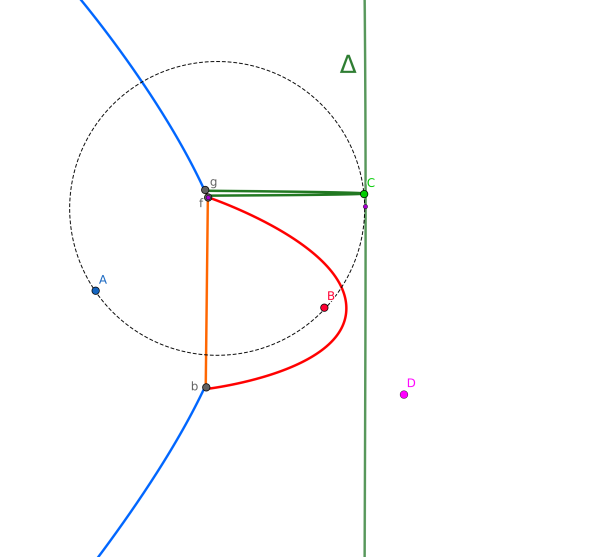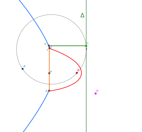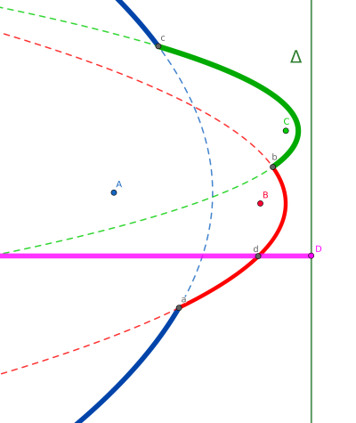 Il faut donc parcourir la plage A-a-B-b-C-c-A. Puisque $y_a \leqslant y_D \leqslant y_b$, on en conclut que le point recherché doit être sur l'arc de foyer B (rouge). Maintenant que l'on sait cela, on peut calculer les coordonnées du point d. On sait déjà que $y_d = y_D$. Il s'agit de calculer, pour la parabole de foyer B, le $x$ correspondant.