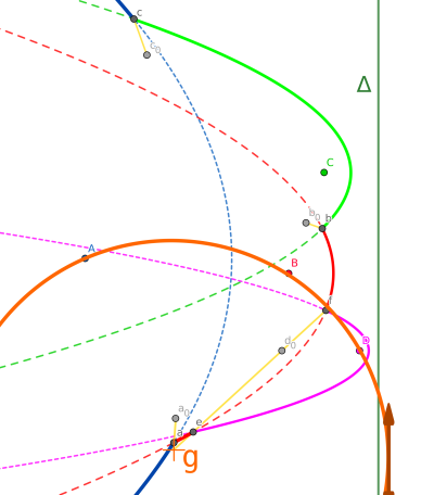 Les points $e$ et $f$ sont les intersections de part et d'autre de D. Quand D est apparu (quand $\Delta$ est passé sur D), les points $e$ et $f$ étaient confondus en $d$. Avec la progression de $\Delta$, ils se sont séparés. On remarque toutefois que $e$, $d$ et $f$ restent alignés.