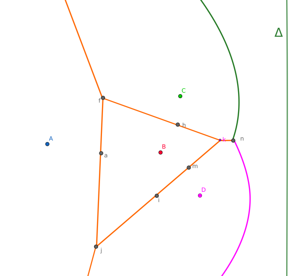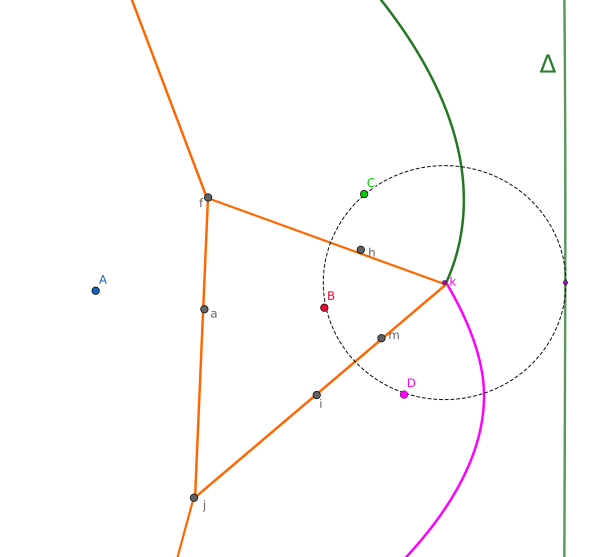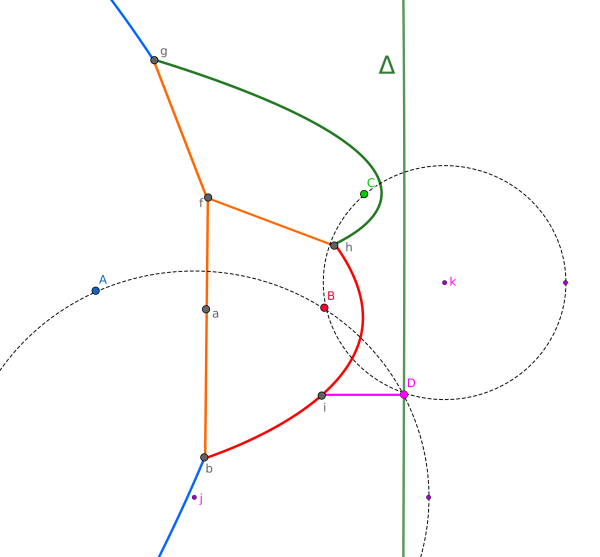 Prenons l'exemple du premier triplet, ABD. Nous devons déterminer le cercle passant par ces trois points. Sur la figure, ce cercle a le centre $g$. Nous savons que $a$ et $e$ vont se rejoindre en $g$.