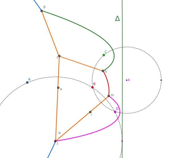 Cette ligne est une parabole de foyer $A$ et de directrice $\Delta$. Connaissant les coordonnées $(x_A ; y_A)$ et l'équation de $\Delta$, on peut calculer l'équation de cette parabole.