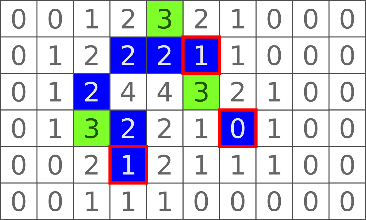Ci-dessous, les cellules encadrée en rouge meurent et celles en vert naissent. Les autres ne changent pas.