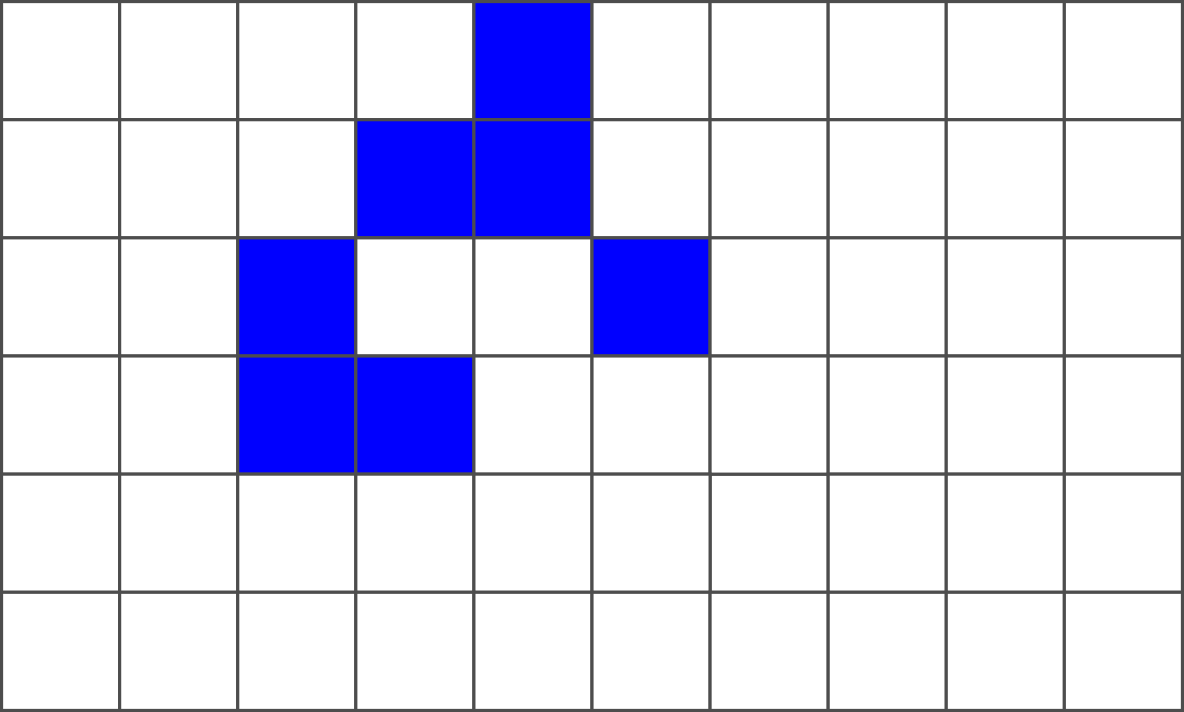 - la grille évolue : certaines cellules meurent (deviennent blanches), et certaines naissent (deviennent bleues),