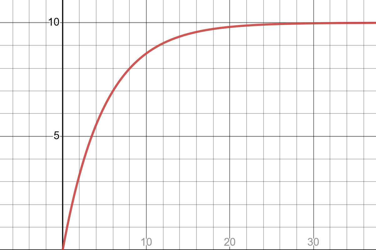 $$f(t) = 10\cdot(1 - \exp\left(-\frac{1}{5}t\right)$$