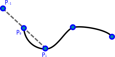 Considérons un arc de spline délimité par les points $P_i$ et $P_{i+1}$. On utilise les points $P_{i-1}$ et $P_{i+2}$ éventuellement construits par symétrie comme expliqué ci-dessus.