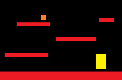 Le personnage en jaune peut sauter sur les plates-formes rouges pour aller chercher le cube orange.