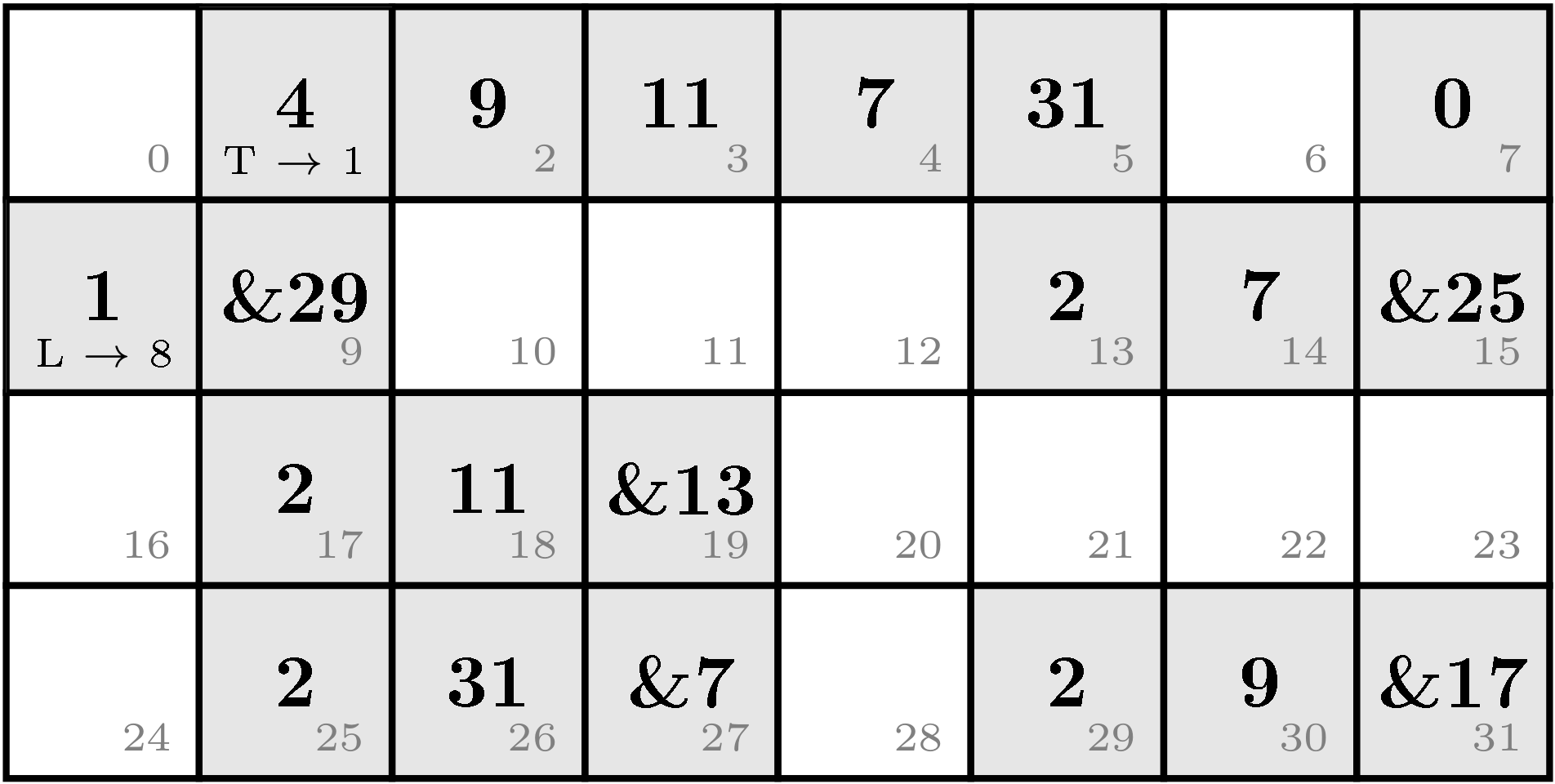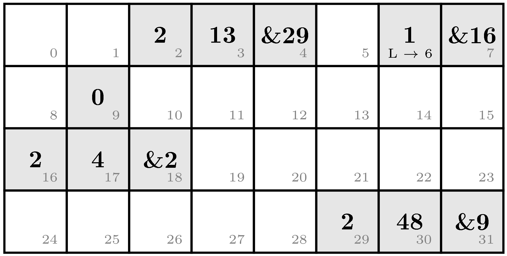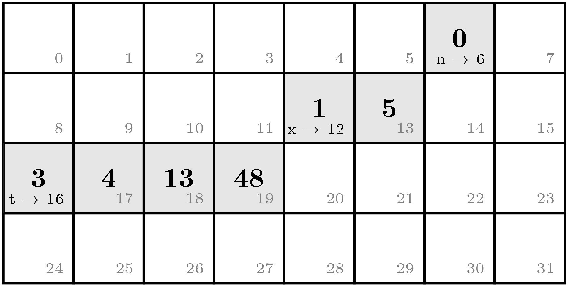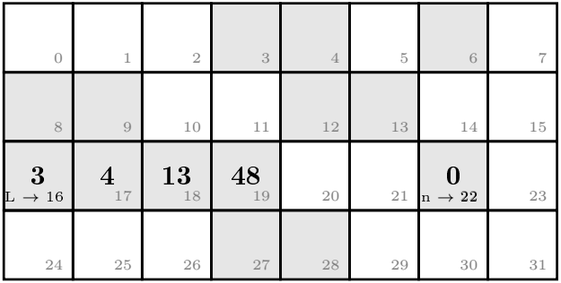 Cette fois, au gré des créations et suppressions, la mémoire se trouve occupée selon la figure – case grise = case occupée. On ne se soucie que de L que l'on modifie et de n qui va poser problème.