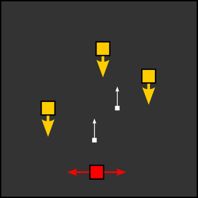 - les morts-vivants, en jaune, apparaissent aléatoirement en haut et avancent vers le bas en ligne droite,